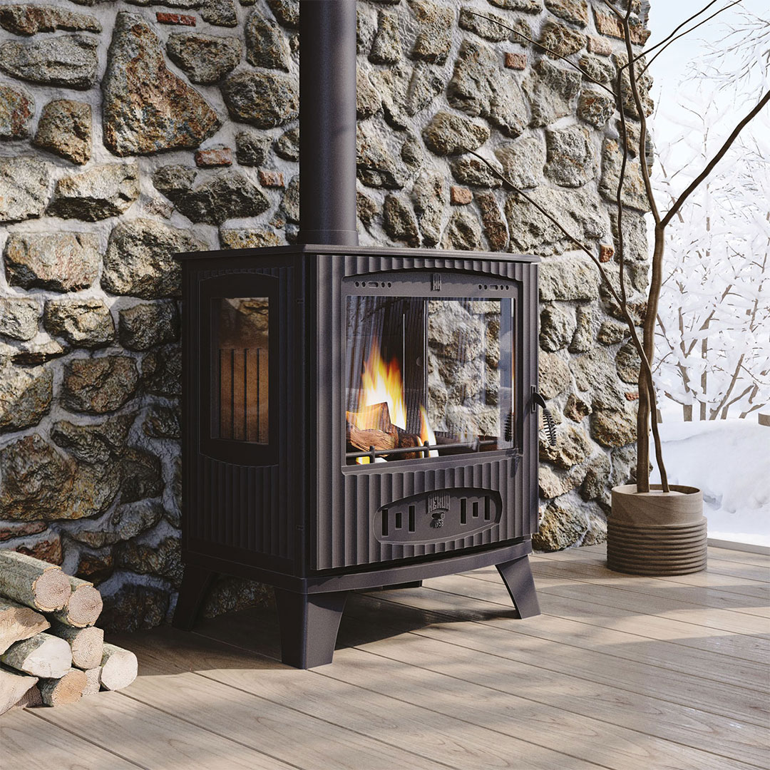 Larissa şömine severler için kompakt ve modern yapıda, üç tarafı camlı olan büyük yanma haznesine sahip bir döküm soba olarak tasarlandı .